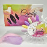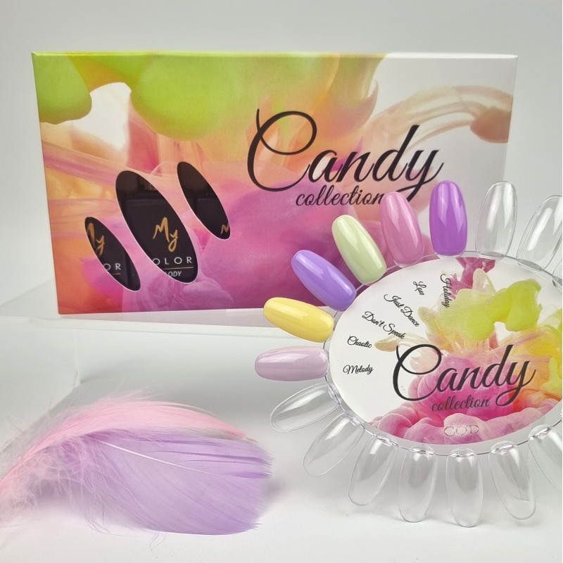 with its natural or transparent colour chart and candy labels with the names of the collection
